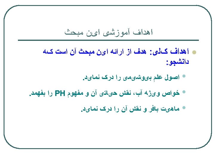 Water, PH and buffer Specific properties of water Hydrogen binding, Acidity, H+, PH and buffer