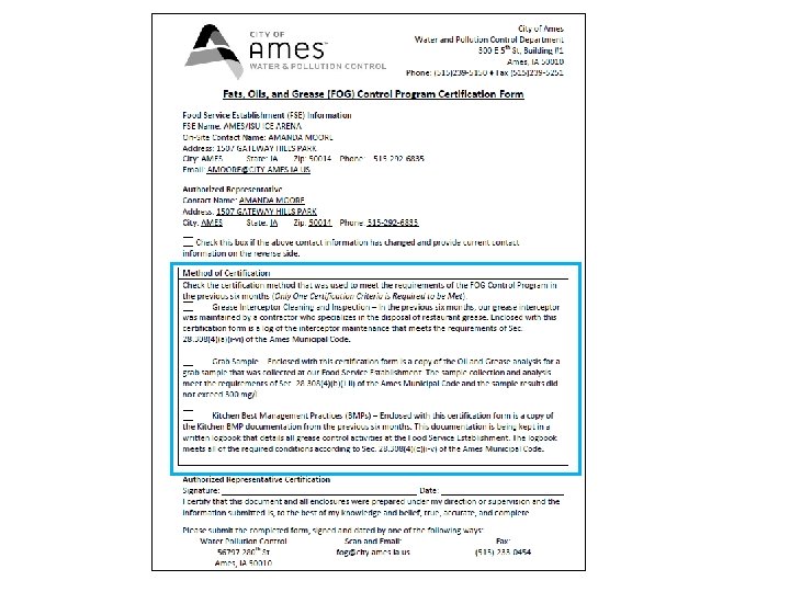 Dustin Albrecht, Environmental Specialist Phone: (515) 239 -5150 E-Mail: dalbrecht@cityofames. org FOG Website: http: //www. cityofames. org/FOG