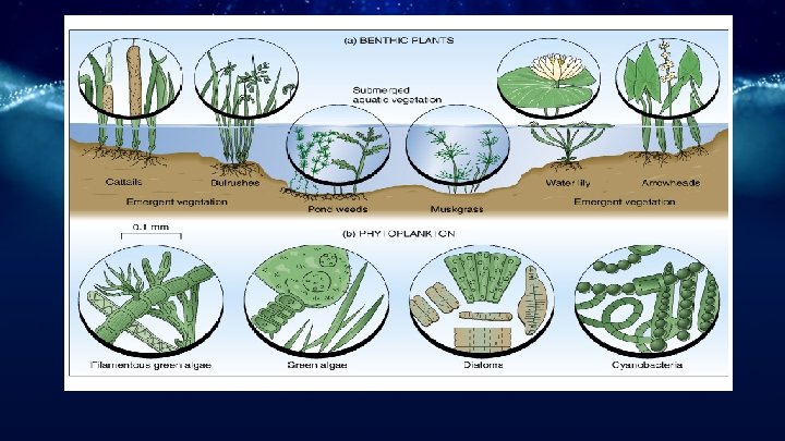 Different Kinds of Aquatic Plants ○ Benthic plants Plants rooted underwater ○ May stick out of the water or be completely submerged ○ ○ Phytoplankton Algae & free floating plants ○ May be single celled or long filaments ○