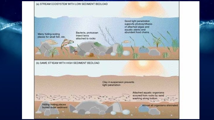 Effect of Sediments on Streams ○ ○ ○ Loss of hiding/resting places for small fish Attached aquatic organisms scoured from the rocks and sand Poor light penetration (increased turbidity)