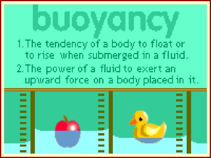 Buoyancy • Buoyancy-the upward force caused by the difference in densities, or more simply-the ability of things to float • How is Buoyancy related to density? • Things float because of density-if you are less dense than something you will float