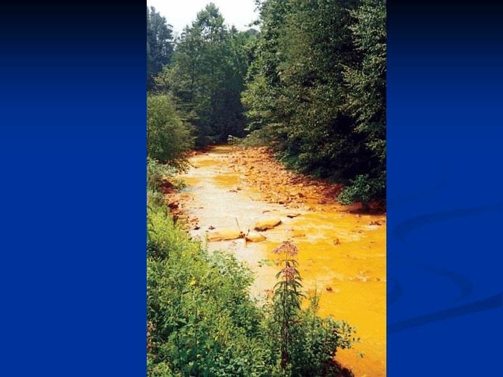 This is an add-in. Yes, I know its not in your packet. Find a space. 1. 2 Fe. S 2 + 7 O 2 + 2 H 2 O 2 Fe. SO 4 + 2 H 2 SO 4 Iron Pyrite (Iron (II) Sulfide) reacts with water and oxygen to form Iron (II) Sulfate and Sulfuric acid 2. 2 Fe 2+ + 1/2 O 2 + 2 H+ 2 Fe 3+ + H 2 O The Iron (II) ion dissociates and oxidizes to form Iron (III) 3. Fe 3+ + 3 H 2 O Fe(OH)3 + 3 H+ Iron (III) ion reacts with water to form the insoluble Iron (III) Hydroxide which is a yellow orange color. Precipitates out of solution and kills fish by clogging their gills. Also makes the water more acidic.
