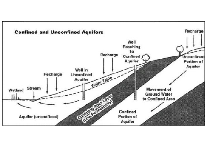 Type of water resource: Ground water: Groundwater is the major source of fresh water and usually considered as more clean the surface water however in recent decade fertilizer and pesticide originating from the agricultural lands and heavy metal from landfill sites are major ground water pollutant. Ground water are mainly withdraw from aquifers. Aquifers: derive from Latin words, "Aqua" (water), and "fer" (to carry). An aquifer is a sub-surface geologic formations (solid rock and/or unconsolidated sediments) that contains ground water in sufficient quantities to be used, or have the potential to be used, for drinking water supply or for commercial, industrial or agricultural purposes. Three type of aquifers are their: Unconfined aquifer: Overlaid by permeable earth materials and they can be recharged by water seeping down from above in the form of rainfall or snow melt. Confined aquifer: are confined between two impermeable layers of rock or sediment and are recharged only in the those areas where the aquifer intersect the land surface. Perched aquifer: water get trapped between impermeable structure, no recharge takes place in these aquifer.