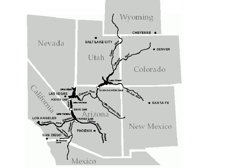 D. Examples – Colorado River Basin (US) – 14 major dams on Colorado River. Supplies water to LA, Las Vegas, San Diego, and Imperial Valley in CA. 1. Problems: Colorado river fed by snow pack in Rockies, area in rain shadow of Rockies, legal pacts allocate more water withdrawal than river actually provides, water does not reach all the way to the Gulf of California.