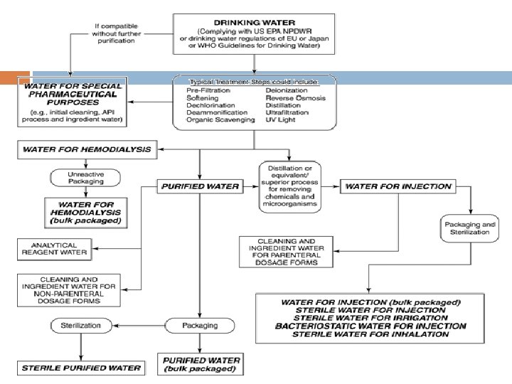 SOURCE WATER AND PRETREATMENT To ensure adherence to minimal chemical and microbiological quality attributes water source should meet the requirements of NPDWR(40 CFR 141) or drinking water regulations of European union or Japan or WHO water guidelines. Pretreatment unit operations should be designed and operated in such a way to adequately remove the disinfectant, drinking water Degradable by products and objectionable degradants.