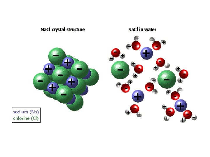 Water as a solvent • The partial charge that develops across the water molecule helps make it an excellent solvent. • Water dissolves many substances by surrounding charged particles and 'pulling' them into solution. • For example, common table salt, sodium chloride, is an ionic substance that contains alternating sodium and chlorine ions.