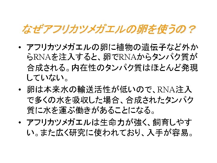 Before discovery of aquaporins (アクアポリン発見前)? H 2 O 液胞膜 Tonoplast 原形質膜(細胞膜) Plasma-membraene After all, the message that appeared in textbooks was that water simply diffused "somehow'' across plants membrane and proteins were not involved in these processes. Biophysicists continued to use pore models to explain membrane permeations without seeking a molecular explanation. A. R. Schaffner Planta 204: 131 -139 (1998)