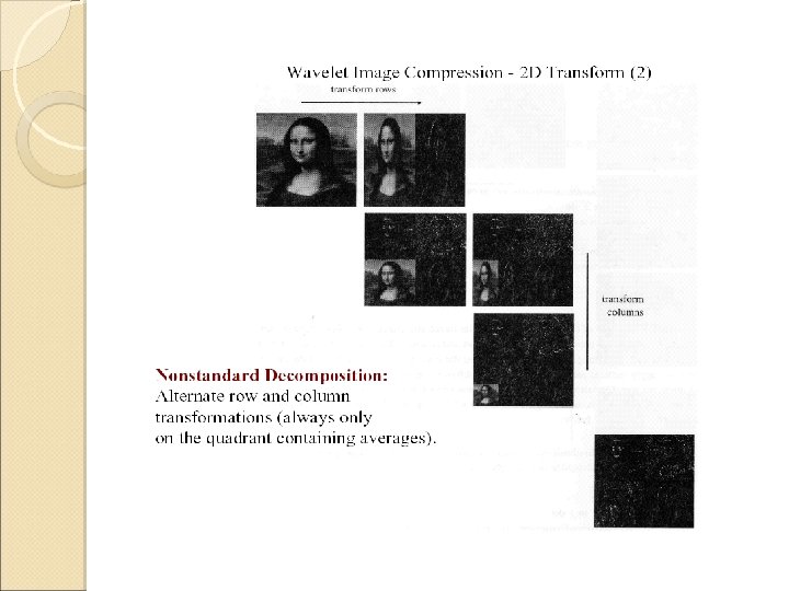 Biorthgonal Wavelets Rather than: where W* =W-1 (orthogonality) Use ‘arbitrary’ matrix and its inverse… (constructed by dilations and translations of course. . )