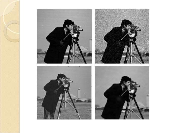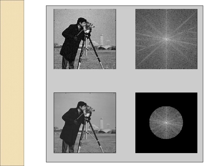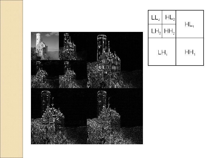 Example Wavelets (finite filters) Haar ◦ The only on of length 2, the anti-symmetric one Length 4: ◦ 3 conditions: ◦ 1 d parameterization: ◦ Daubechies-4 by a=p/3 with 2 V. M. (maximal) Length 6: …