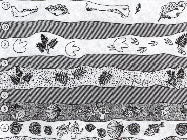 STRATIGRAPIC PRINCIPLES: FAUNAL SUCCESSION & CORRELATION • Different kinds of organisms have lived during different periods in Earth's history and then died off (or went extinct). This is called faunal succession. • If a strata in different outcrops contain the same fossil assemblages, then the outcrops represent the same interval of time. These strata correlate. M&W 4 Fig. 17. 6; M&W 5 Fig. 17. 6
