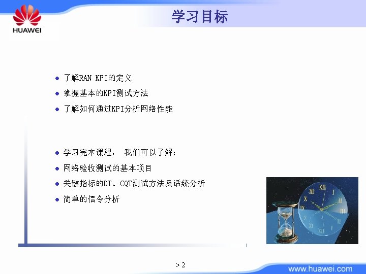 KPI 简介 Hua. Wei RAN KPIs Coverage Accessability • Coverage Ratio • WCDMA Availability • Soft Handover Ratio • Attach Success Ratio • Pilot Pollution Ratio • Service Access Success Ratio (MO-Voice, Video Phone, SMS) • End-to-end Access Success Ratio (MT-Voice, Video Phone, SMS) • PDP Context Activation Success Ratio Retainability Service Integrity • Call Drop Ratio (Voice, Video Phone) • Voice Quality (MOS) • PDP Context Drop Ratio • Date Transfer Drop Ratio • Video Phone (Synchroniza tion between voice and image ) • Service UL/DL BLER (Voice, Video Phone) • PS Mean Throughput (RLC – 64 K/128 K/384 K/HSPA) >8 Mobility • Soft Handover Success Ratio • Hard Handover Success Ratio • Inter-RAT Handover Success Ratio Delay Availability • Attach Setup Time • Worst cell ratio • PDP Context Activation Time • Admission refusal ratio • Service Access Time • End-to-end Access Time • Packet Round Trip Time (Initial/ Continuous Ping) • Transfer Interruption Time • Paging congestion ratio • DL transmission resource utilizing ratio