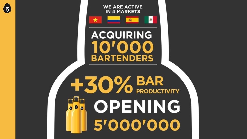 The WECHEER platform improves bartender productivity by +30% helping bar owners to increase total sales & performance of their locations Without WECHEER 13 Bottles / Bartender / Day With CHEERCOIN Incentive 17 Bottles / Bartender / Day 25 20 1 5 10 5 0 1 7 1 3