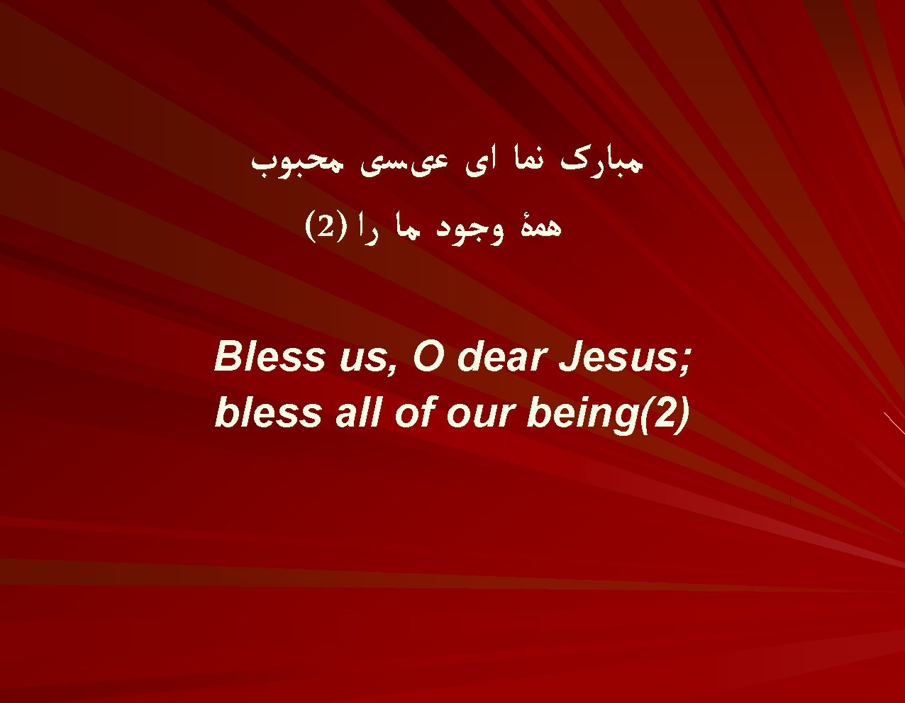 ﺑﺎ ﺍیﻤﺎﻥ آﻤﺪﻩ ﺑﻪ ﺍیﻤﺎﻥ پﺬیﺮﻡ ﺑﺮکﺎﺕ ﺳﻤﺎﻭی ﺭﺍ ﺗﺸﻨﻪﺍﻡ ﺗﺸﻨـۀ ﺣﻀﻮﺭ آﺴﻤﺎﻥ ﺳیﺮﺍﺑﻢ ﻧﻤﺎ چﺸﻤۀ ﺟﺎﻥ We have come in faith And in faith we accept the blessing of Heaven I am thirsty, thirsty for the presence of Heaven Quench my thirst, source and spring of my soul