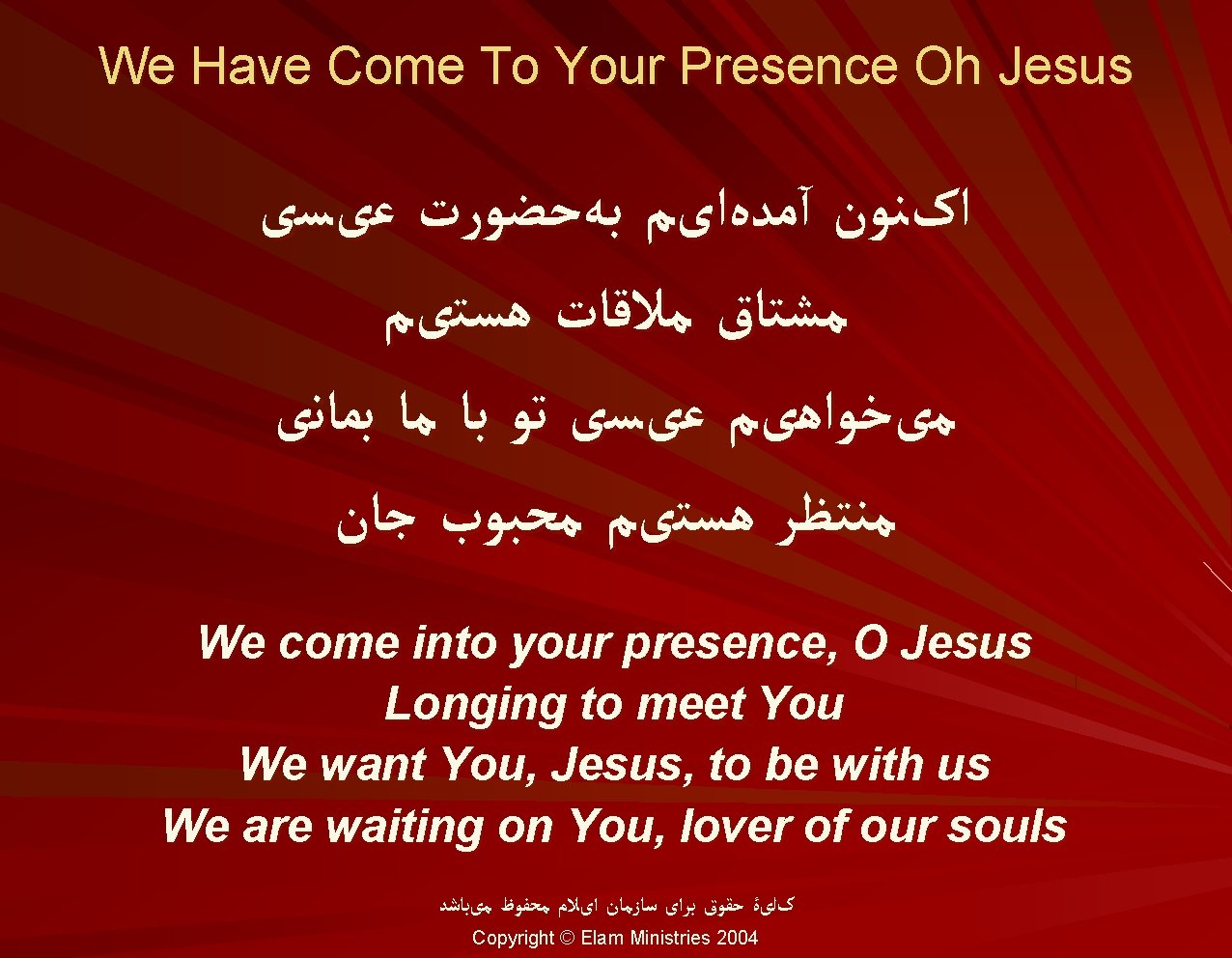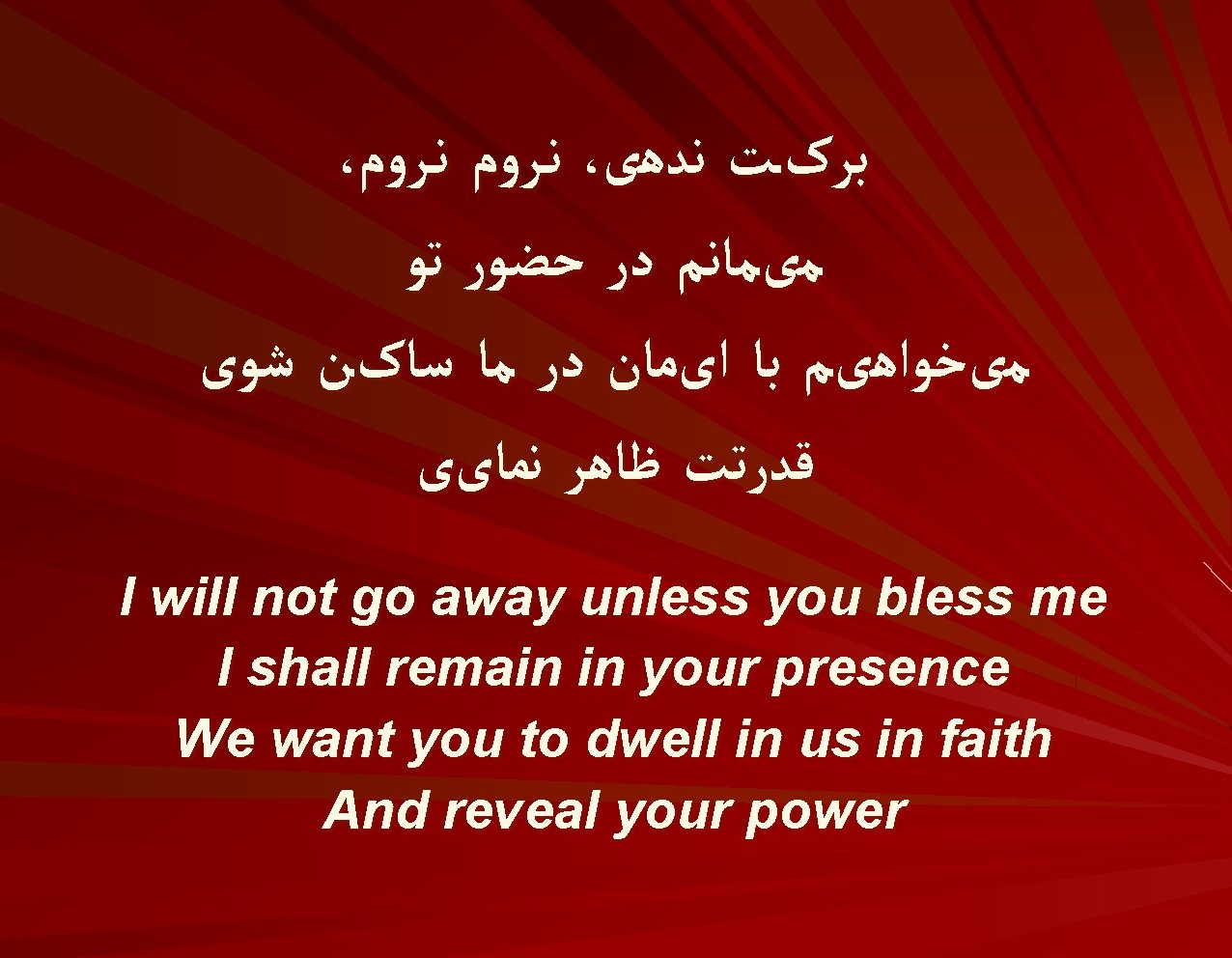 ﺑﺎ ﺍیﻤﺎﻥ آﻤﺪﻩ ﺑﻪ ﺍیﻤﺎﻥ پﺬیﺮﻡ ﺑﺮکﺎﺕ ﺳﻤﺎﻭی ﺭﺍ ﺗﺸﻨﻪﺍﻡ ﺗﺸﻨـۀ ﺣﻀﻮﺭ آﺴﻤﺎﻥ ﺳیﺮﺍﺑﻢ ﻧﻤﺎ چﺸﻤۀ ﺟﺎﻥ We have come in faith And in faith we accept the blessing of Heaven I am thirsty, thirsty for the presence of Heaven Quench my thirst, source and spring of my soul