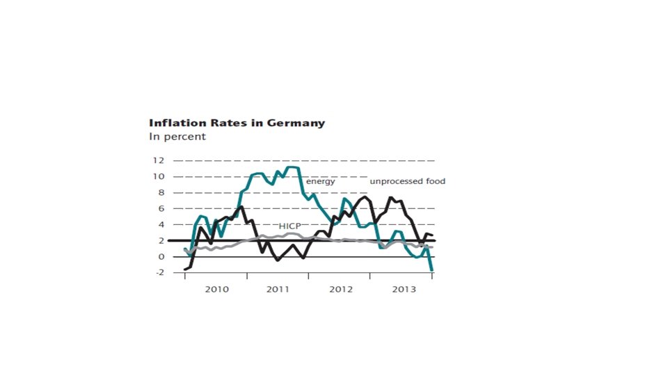 Weak inflation below ECB target • The rates of inflation (measured by HICP) in the individual member states of the euro area vary greatly from -1. 6 percent (Cyprus) to 1. 9 percent (Finland). In January 2014 inflation in Germany was at 1. 2 percent, slightly higher than the euro area average. • Greece (-1. 4 percent) and Cyprus are the only member states experiencing deflation, though inflation is at a historic low in all the other crisis countries (Spain: 0. 3 percent, Italy: 0. 6 percent, Ireland: 0. 3 percent, Portugal: 0. 1 percent)