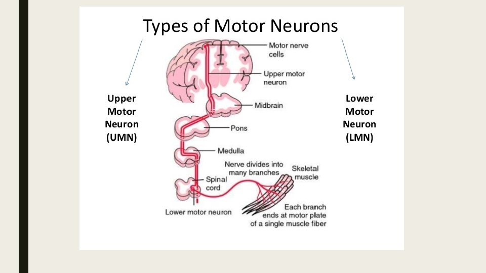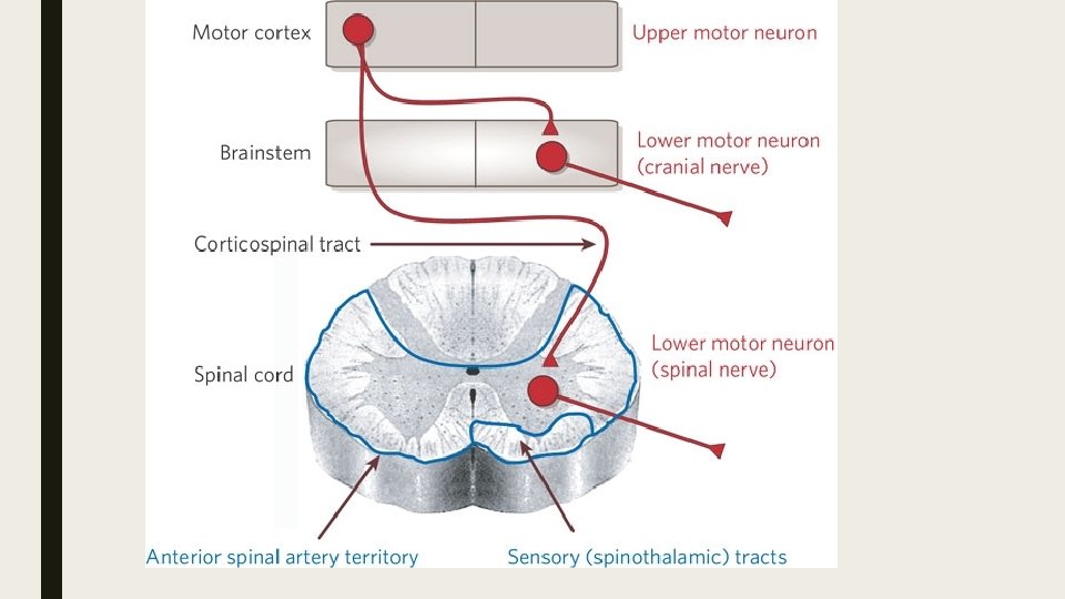 Upper Motor Neurone lesion ■ A lesion of the cerebral cortex or corticospinal tract – Spasticity of extension in the upper limbs and spasticity of flexion in the lower limbs – Hyperreflexia – Pronator drift – Evoked paraesthesia – Babinski positive – Normal muscle bulk