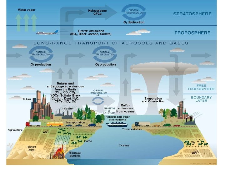 Atmosphere Comp. Continued n n n 3. Trace gases n a. the remaining 1% consists of Ar (0. 9340%), CO 2 (0. 038%) and small amounts of other gases. n b. Carbon dioxide is absorbed by plants to produce food, and released by the burning of fuels and coal. As a result CO 2 accumulates in the atmosphere. 4. Water Vapor n a. water vapor is invisible. It is water in the form of a gas and it plays an important role in regulating earth’s weather. n b. air has a varying amount of water vapor (1% on average) n c. it produces clouds and precipitation. 5. Solid and Liquid Particles n a. air contains particles of dust, smoke, salt, and other chemicals.