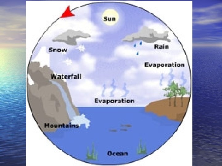 The Water Cycle • The sun heats up the water- evaporation • The water vapor (gas) condenses into clouds • The clouds become saturated and precipitation is the result. • The precipitation pools in lakes, oceans and rivers. Waiting to evaporate again.