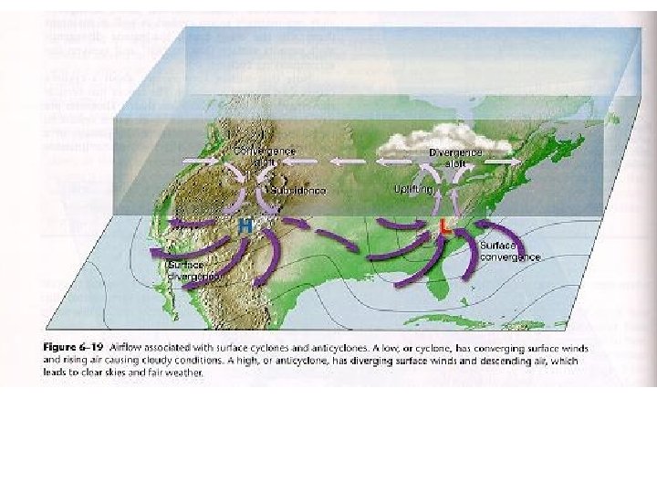 Anticyclones • Enclosed areas of high pressure. • Shown on weather maps by “H” • In the Northern Hemisphere, upper level winds rotate clockwise around H pressure systems. In near surface H pressure systems air spirals out from the central H in a clockwise rotation. • In the Southern Hemisphere, upper level winds rotate counterclockwise around H pressure systems. In near surface H pressure systems air spirals out from the central H in a counterclockwise rotation. • Results: – Inhibits cloud growth because of divergence – Low wind speeds – Clear skies