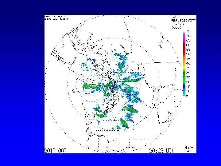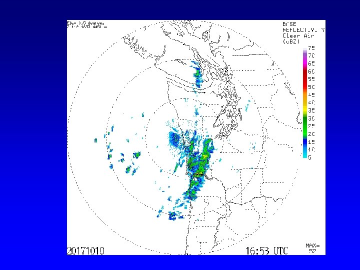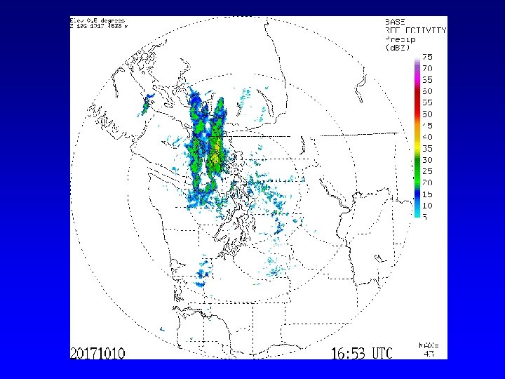Reading a Radar Image • Remember the beam can be blocked by mountains and is higher farther from the radar. • Time below is in UTC (GMT). – UTC=PST +8 hr