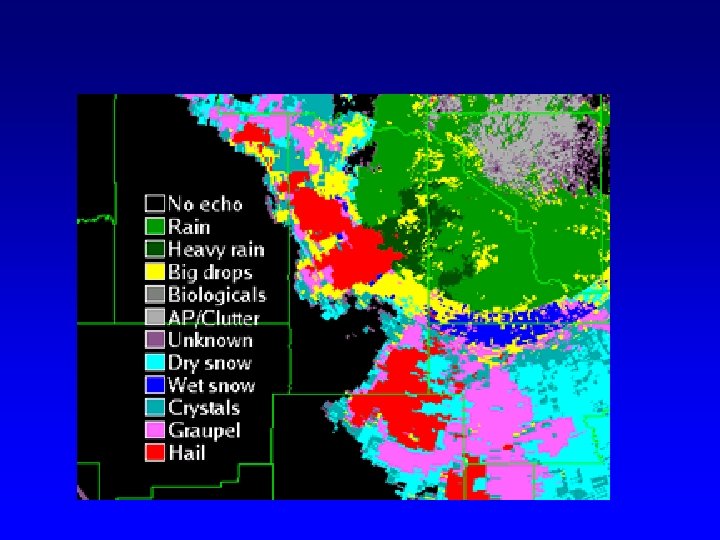 The amount of radar signal returned tells one about the nature of the object: type and intensity of precipitation • Big objects (eg. , large rain drops associated with heavy rain)---big return • Small objects—lesser return • More objects—more return • Amount scattered ~ D 6 where D is diameter