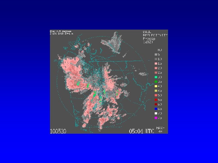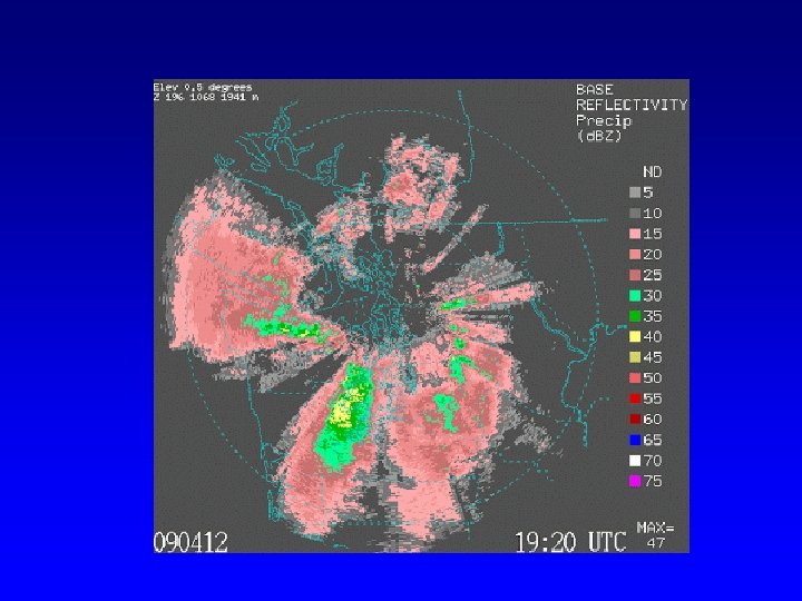 Reading a Radar Image • Most radar imagery has much in common. • Intensity of precipitation is color coded (units—db. Z)