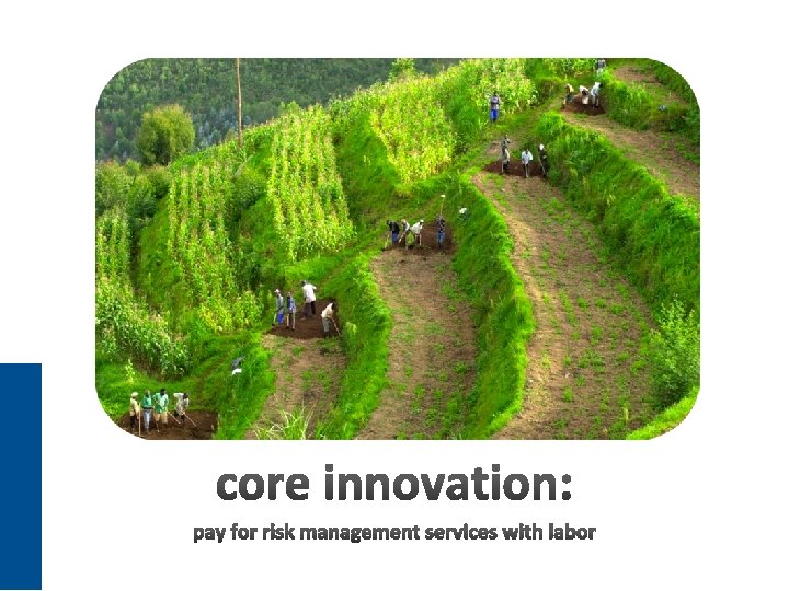 WRMF activities • 36 weather index insurance programs evaluated and reviewed • A comprehensive analysis of opportunities, challenges and good practice with WII • Five appraisal missions (Kenya, India, Mali, Ethiopia, China) • Two pilots (Ethiopia and China) • R 4 initiative together with OXFAM • Testing remote sensing in Mali