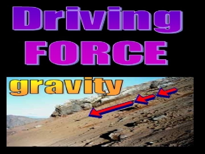 What is Gravity? • A force that moves rocks and other materials downhill; • The force that pulls objects towards each other. Gravity is the underlying force behind all erosion; it may act alone or with a transporting agent: v a. v causes water to flow downhill. v causes glaciers to flow down a valley or spread outward. v causes winds by pulling heavier (more dense) cold air beneath (less dense) warm air.