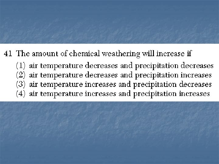 Climate and Weathering n Climate plays a very important role in weathering. n The temperature and amount of moisture influences the type of weathering that will occur. n Warm and wet climates produce mostly chemical weathering. Never any frost wedging.