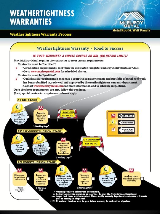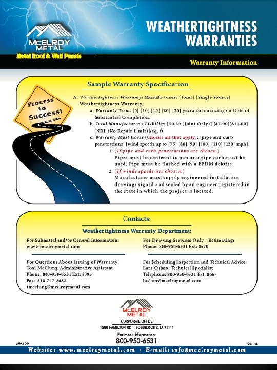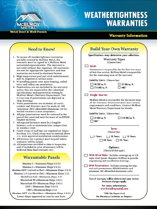 Good To Know • Mc. Elroy Metal has produced a brochure to help you with Weathertightness Warranties. • All warranties must be approved through the Warranty Department. • Any changes to the warranties must be approved through the warranty department. • Warranty Department must do all inspections or contract with a third party firm to do inspections. • For a customer to qualify for a Single Source or No Repair Limit Warranty, they must be a certified Mc. Elroy installer and must have on record three previously inspected and approved weathertightness warranties.
