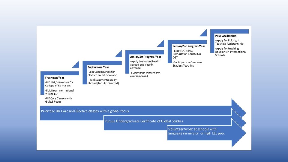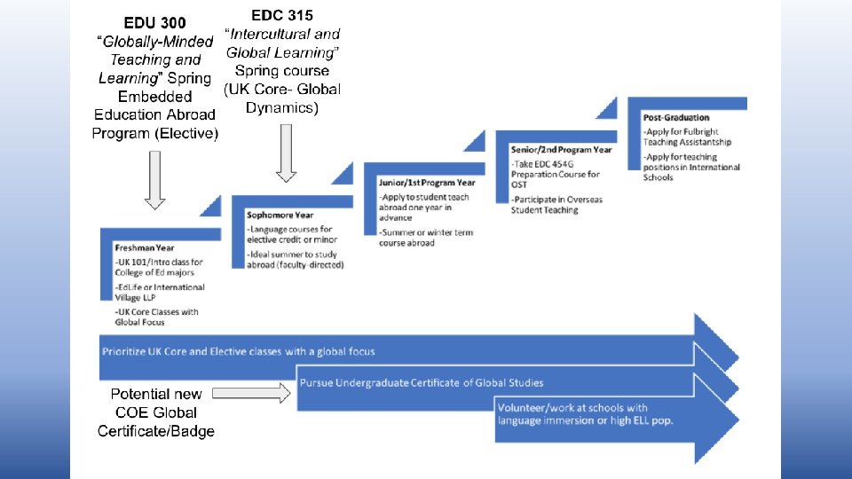 Sampling UK’s Initiatives • • • Overseas Student Teaching – Preparation, Placement, Practice Global Teaching Fellows Project Global Pathway formed from Strategic Plan