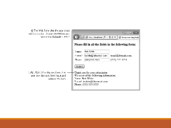 Validation Controls (cont. ) Validating Input in a Web Form The previous Web Form prompts the user to enter a name, e-mail address and phone number. After the user enters any data, but before the data is sent to the web server, validators ensure that the user entered a value in each field and that the e-mail address and phone-number values are in an acceptable format.