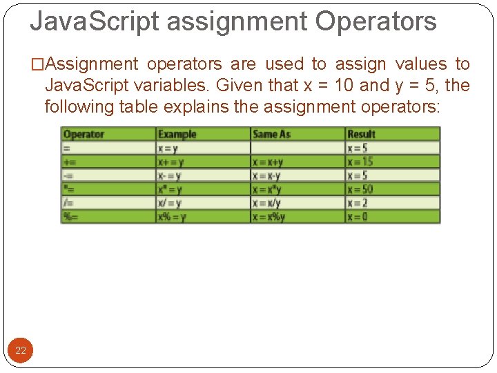 Java. Script assignment Operators �Assignment operators are used to assign values to Java. Script variables. Given that x = 10 and y = 5, the following table explains the assignment operators: 22