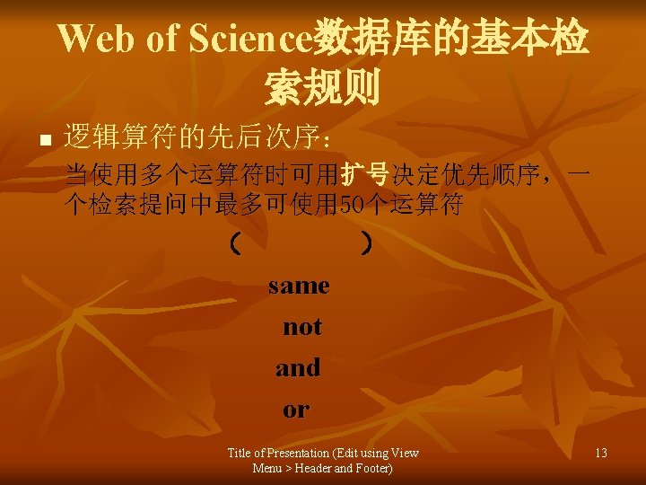 主要内容 n n n Web of Science数据库简介 Web of Science数据库的基本检索规则 Web of Science数据库的基本检索操作 Title of Presentation (Edit using View Menu > Header and Footer) 2