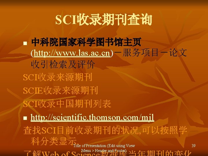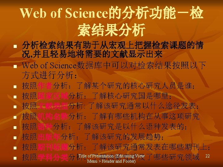 Web of Science数据库的检索操 作-引文检索 会议、专著文献查引用 n 例4:李建平,2001:全球大气环流气 候图集-Ⅰ 气候平均态,气象出版社。 (Atlas of Climate of Global Atmospheric Circulation Ⅰ. Climatological Mean State. Beijing: China Meteorological Press, 279 pp. ) n 例5:Xu Kaixin, Enhancing TCP fainess in ad hoc wireless networks using neighborhood RED, ACM Mobicom 2003, 16 -28 Title of Presentation (Edit using View 21 Menu > Header and Footer)