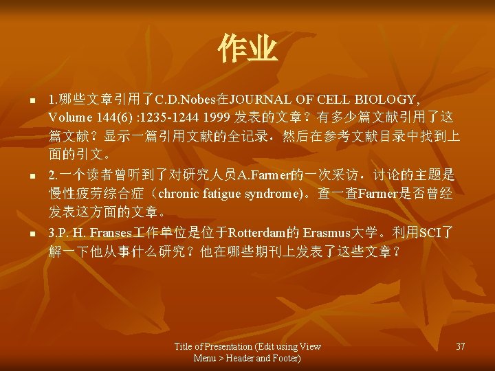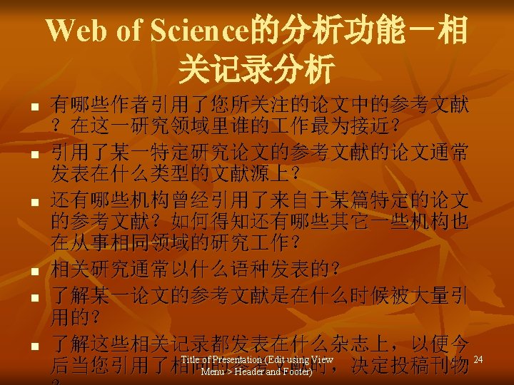 Web of Science数据库的检索操 作-引文检索 Title of Presentation (Edit using View Menu > Header and Footer) 18
