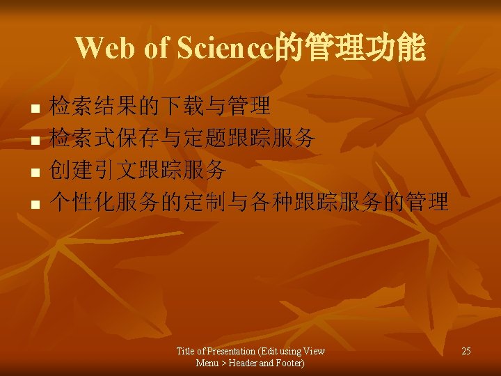 培训内容 n n n Web of Science数据库简介 Web of Science数据库的基本检索规则 Web of Science数据库的基本检索操作 Title of Presentation (Edit using View Menu > Header and Footer) 9