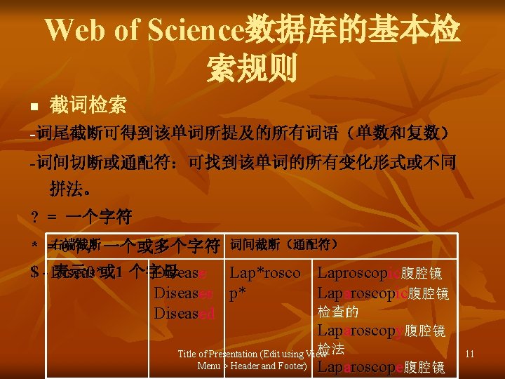 Web of Science数据库的基本检 索规则 NOT Title of Presentation (Edit using View Menu > Header and Footer) 10