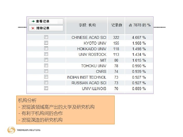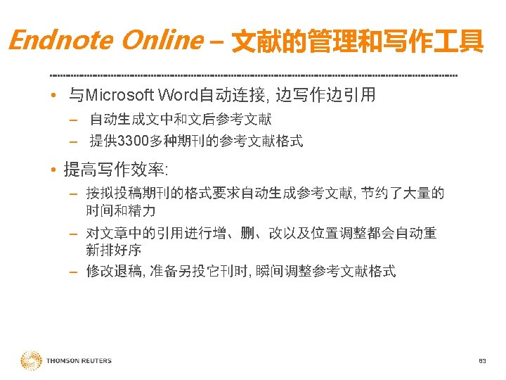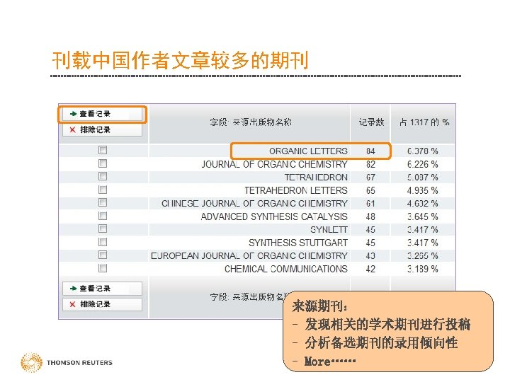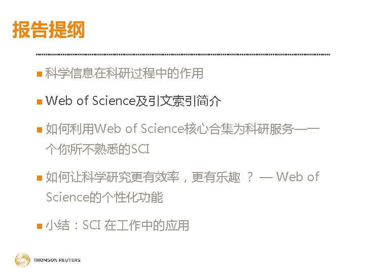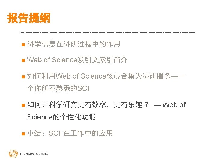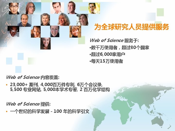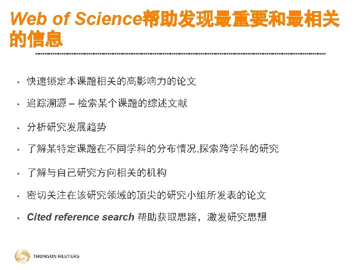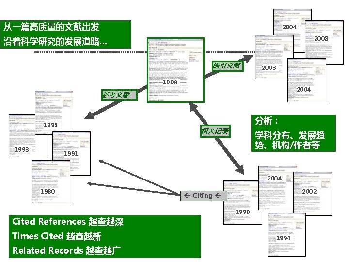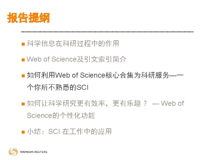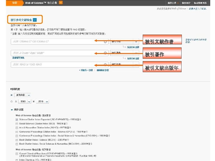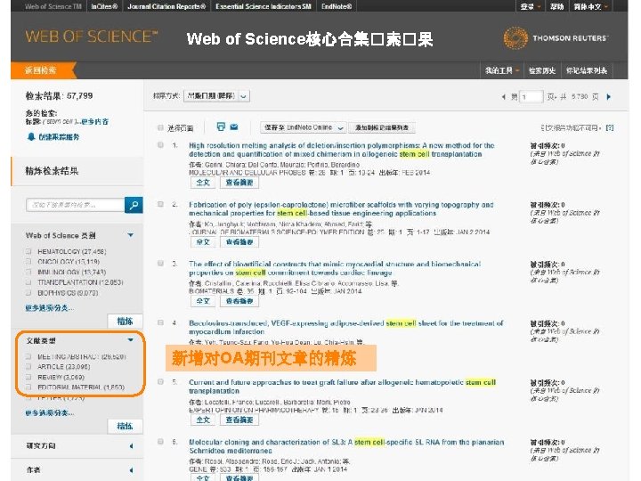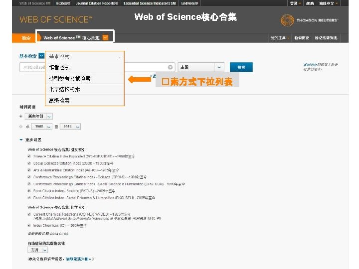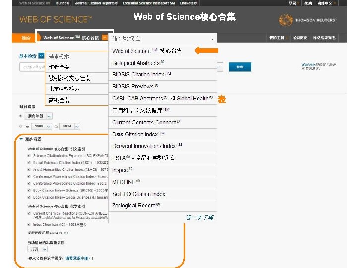 Web of Science核心合集权威的参考数据 Science Citation Index Expanded (科学引文索引, SCIE) 176个学科,8621种期刊,数据最早回溯至 1900年 Social Sciences Citation Index (社会科学引文索引, SSCI) 56个学科,3121种期刊,数据最早回溯至 1900年 Arts & Humanities Citation Index (艺术与人文引文索引, A&HCI) 28个学科,1728种期刊,数据最早回溯至 1975年 § Conference Proceedings Citation Index – Science (会议录引文索引– 自然科学版), 1990 - § Conference Proceedings Citation Index – Social Science & Humanities (会议录引文索引– 社会科学与人文版), 1990 - § Book Citation Index - Science + Social Science & Humanities (图书引文索引–自然科学版 + 社会科学与人文版) 2005 - • IC和CCR 数据收集日: 2013 -02 -28