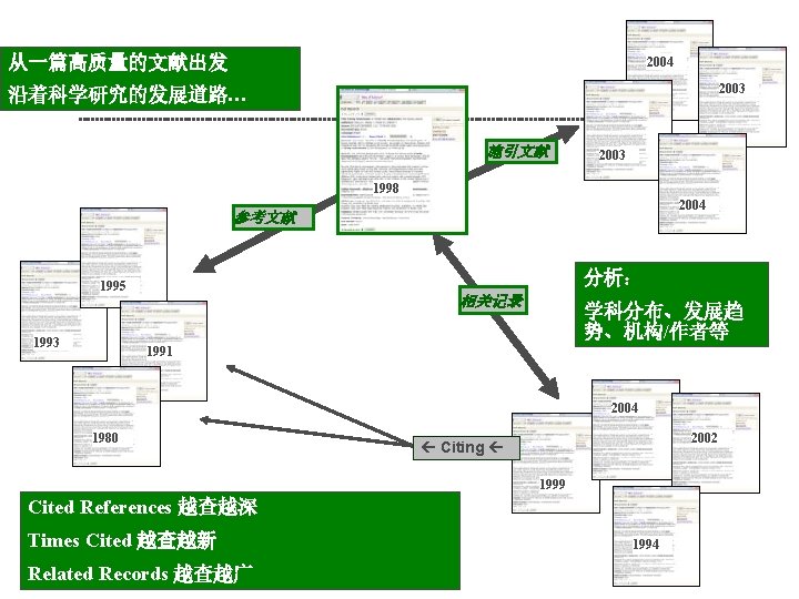 引文索引 • Dr. Garfield 1955年在 Science 发表 论文提出将引文索引作为一种新的文献 检索与分类 具。将一篇文献作为检索 字段从而跟踪一个Idea的发展过程 • 1963年出版 Science Citation Index • 1973年出版 Social Sciences Citation Index • 1978年出版Arts & Humanities Citation Index Dr. Eugene Garfield Founder & Chairman Emeritus ISI, Thomson Scientific “Our ultimate goal is to extend our retrospective coverage of the scientific literature back to the twentieth century. The Century of Science initiative makes that dream come true. ” 12