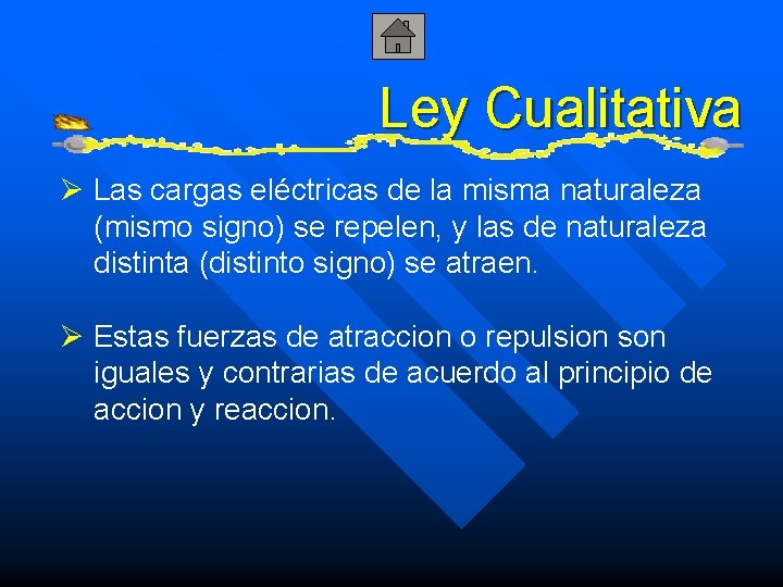 Ley Cualitativa Ø Las cargas eléctricas de la misma naturaleza (mismo signo) se repelen, y las de naturaleza distinta (distinto signo) se atraen. Ø Estas fuerzas de atraccion o repulsion son iguales y contrarias de acuerdo al principio de accion y reaccion.