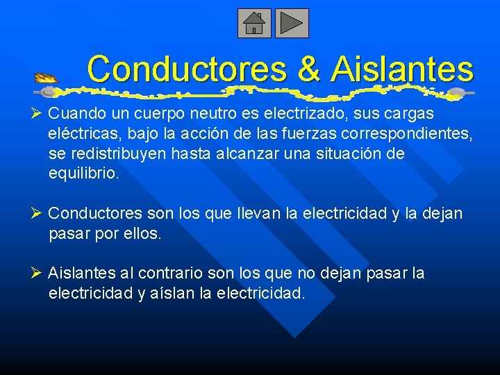 Conductores & Aislantes Ø Cuando un cuerpo neutro es electrizado, sus cargas eléctricas, bajo la acción de las fuerzas correspondientes, se redistribuyen hasta alcanzar una situación de equilibrio. Ø Conductores son los que llevan la electricidad y la dejan pasar por ellos. Ø Aislantes al contrario son los que no dejan pasar la electricidad y aíslan la electricidad.
