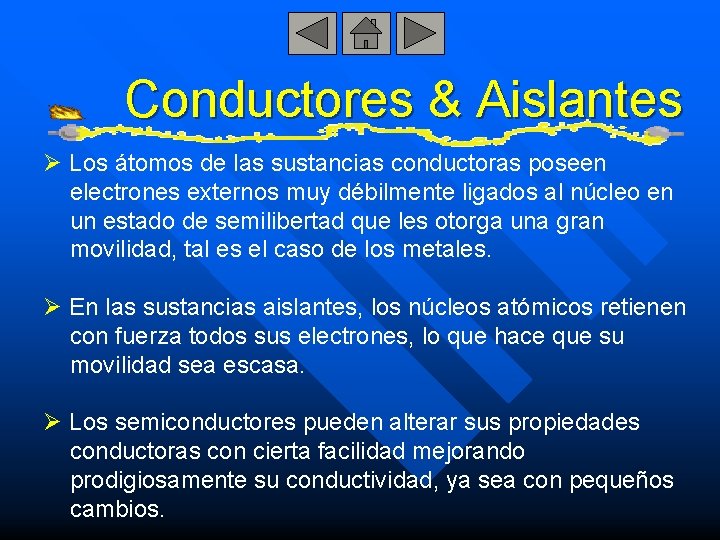 Conductores & Aislantes Ø Los átomos de las sustancias conductoras poseen electrones externos muy débilmente ligados al núcleo en un estado de semilibertad que les otorga una gran movilidad, tal es el caso de los metales. Ø En las sustancias aislantes, los núcleos atómicos retienen con fuerza todos sus electrones, lo que hace que su movilidad sea escasa. Ø Los semiconductores pueden alterar sus propiedades conductoras con cierta facilidad mejorando prodigiosamente su conductividad, ya sea con pequeños cambios.