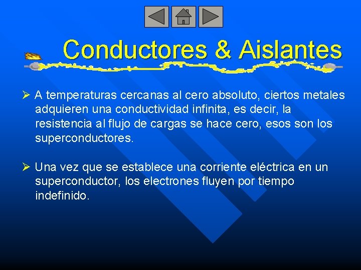 Conductores & Aislantes Ø A temperaturas cercanas al cero absoluto, ciertos metales adquieren una conductividad infinita, es decir, la resistencia al flujo de cargas se hace cero, esos son los superconductores. Ø Una vez que se establece una corriente eléctrica en un superconductor, los electrones fluyen por tiempo indefinido.