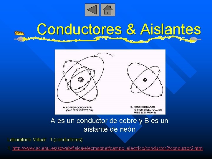 Conductores & Aislantes A es un conductor de cobre y B es un aislante de neón Laboratorio Virtual: 1. (conductores) 1. http: //www. sc. ehu. es/sbweb/fisica/elecmagnet/campo_electrico/conductor 2. htm