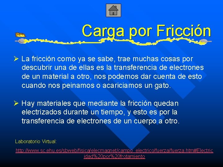 Carga por Fricción Ø La fricción como ya se sabe, trae muchas cosas por descubrir una de ellas es la transferencia de electrones de un material a otro, nos podemos dar cuenta de esto cuando nos peinamos o acariciamos un gato. Ø Hay materiales que mediante la fricción quedan electrizados durante un tiempo, y esto es por la transferencia de electrones de un cuerpo a otro. Laboratorio Virtual: http: //www. sc. ehu. es/sbweb/fisica/elecmagnet/campo_electrico/fuerza. htm#Electric idad%20 por%20 frotamiento
