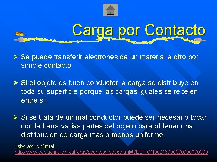 Carga por Contacto Ø Se puede transferir electrones de un material a otro por simple contacto. Ø Si el objeto es buen conductor la carga se distribuye en toda su superficie porque las cargas iguales se repelen entre sí. Ø Si se trata de un mal conductor puede ser necesario tocar con la barra varias partes del objeto para obtener una distribución de carga más o menos uniforme. Laboratorio Virtual: http: //www. cec. uchile. cl/~cutreras/apuntes/node 6. html#SECTION 0021300000000
