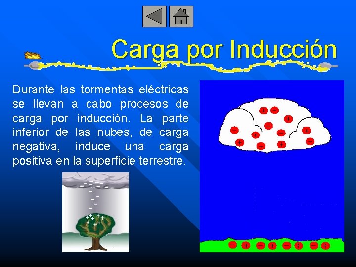 Carga por Inducción Durante las tormentas eléctricas se llevan a cabo procesos de carga por inducción. La parte inferior de las nubes, de carga negativa, induce una carga positiva en la superficie terrestre.