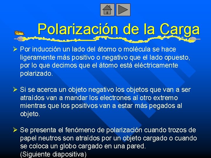 Polarización de la Carga Ø Por inducción un lado del átomo o molécula se hace ligeramente más positivo o negativo que el lado opuesto, por lo que decimos que el átomo está eléctricamente polarizado. Ø Si se acerca un objeto negativo los objetos que van a ser atraídos van a mandar los electrones al otro extremo mientras que los positivos van a estar más pegados al objeto. Ø Se presenta el fenómeno de polarización cuando trozos de papel neutros son atraídos por un objeto cargado o cuando se coloca un globo cargado en una pared. (Siguiente diapositiva)