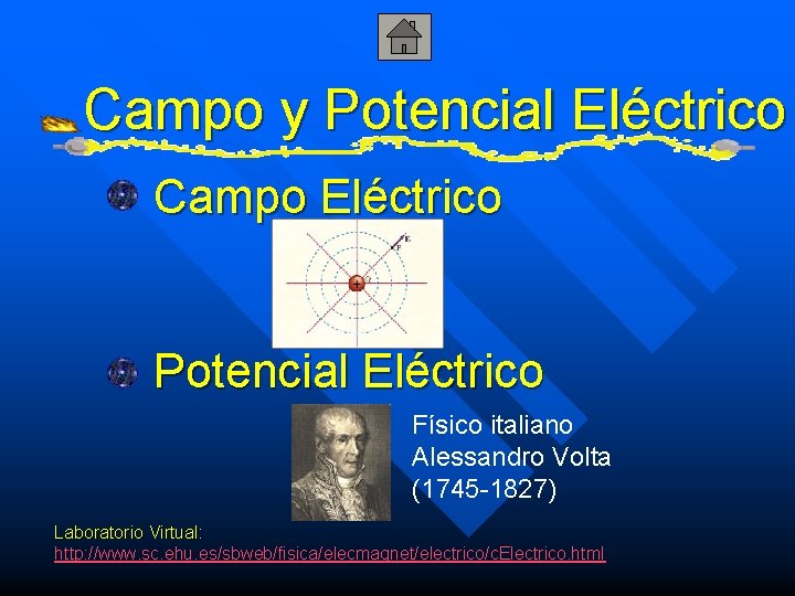 Campo y Potencial Eléctrico Campo Eléctrico Potencial Eléctrico Físico italiano Alessandro Volta (1745 -1827) Laboratorio Virtual: http: //www. sc. ehu. es/sbweb/fisica/elecmagnet/electrico/c. Electrico. html
